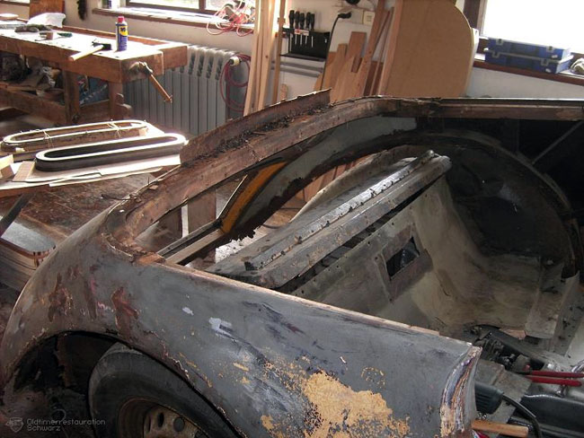 Besonders der Bereich über der Hinterachse erweist sich bei vielen Oldtimer als sehr gefährdet- so wie auch bei diesem Fahrzeug.Im Anlieferungszustand(Bild1) kann man die gebrochenen Holz- und Blechkonstruktion erkennen.Die Türen wurden auf Kundenwunsch nicht sandgestrahlt, da diese Türen wenig gebaucht sind und so schnell Ihre Eigenspannung verlieren würden.